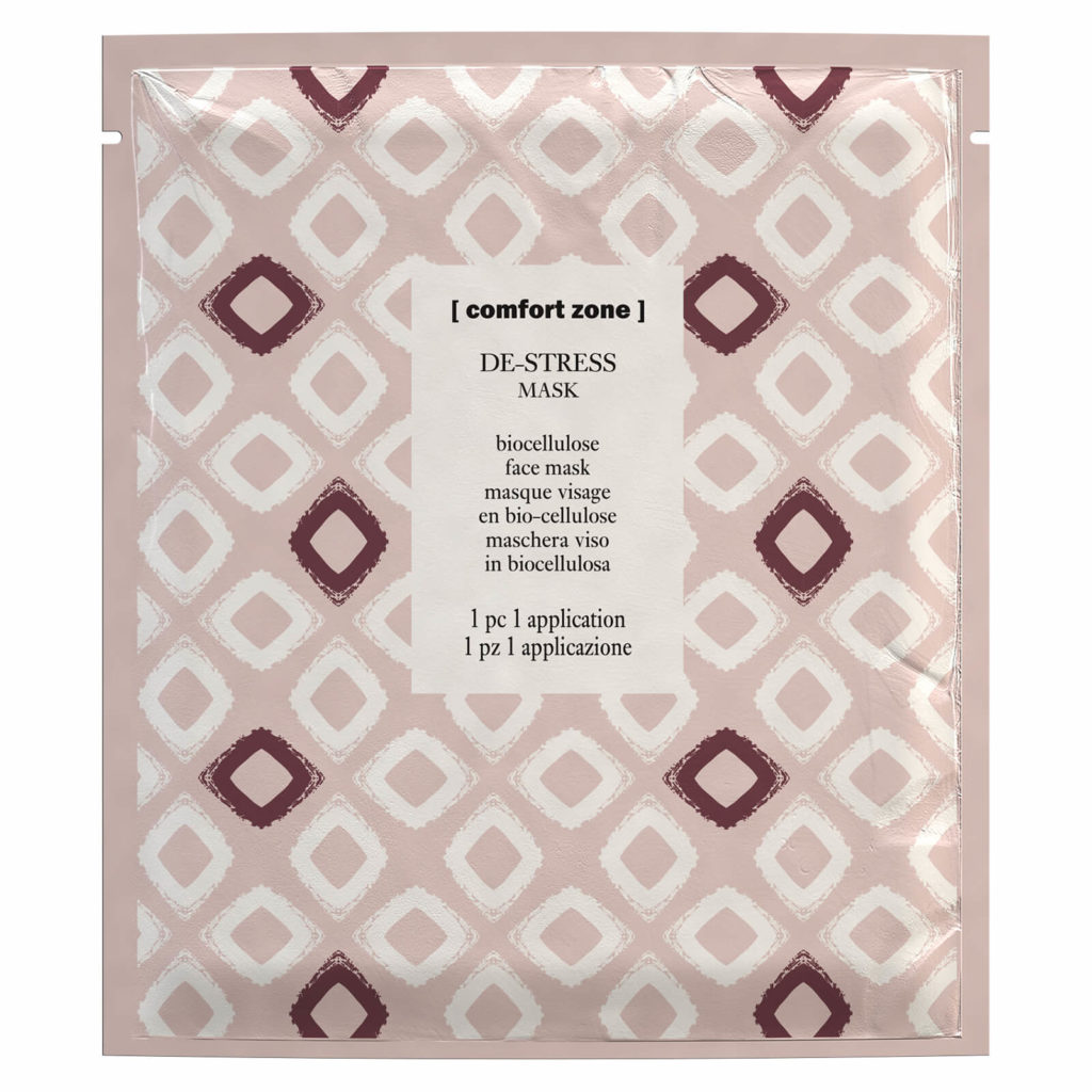 Maska za odstranjevanje stresa Comfort Zone, oblikovana za nego utrujene kože, pomaga oživiti polt, ki je bila obrabljena zaradi izpostavljenosti okolja. Ne glede na to, ali gre za močan veter ali sončne žarke, lahko zunanji svet uniči kožo z občutljivim naravnim ravnovesjem. Maska za obraz je narejena iz bioceluloze, ki je pridobljena iz fermentiranih kokosovih orehov, kar ji pomaga, da se popolnoma oprime edinstvenih kontur obraza za optimalno vpijanje. Pomirjujoča, hidratantna Aloe deluje tako, da pomirja in osveži ob naravnem pomirjujočem kompleksu, medtem ko je ognjič namenjen preprečevanju vnetij za dolgotrajno udobje.