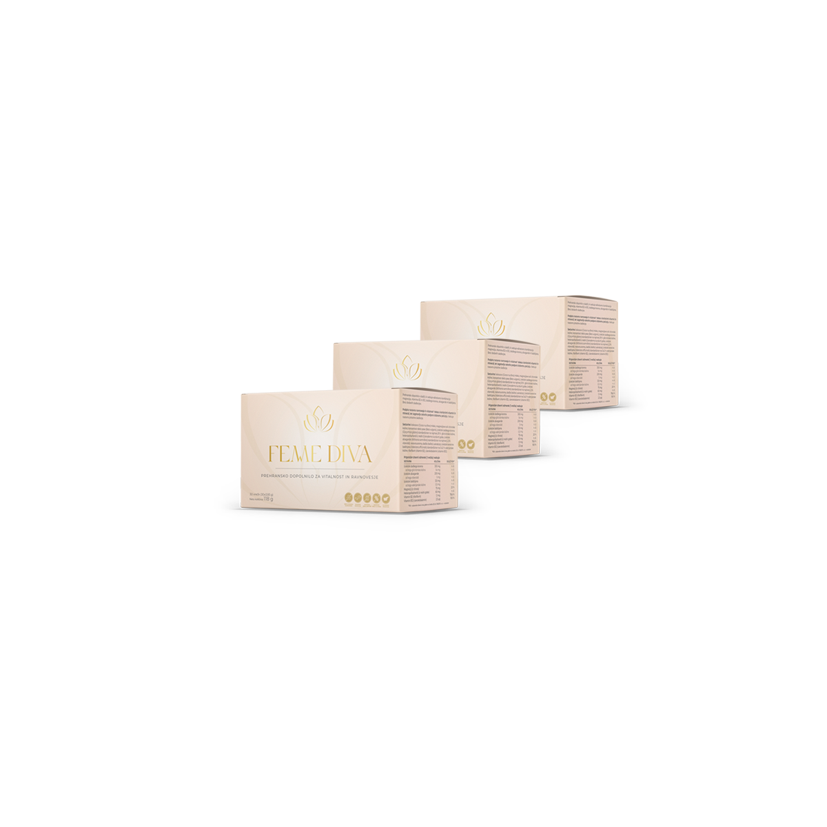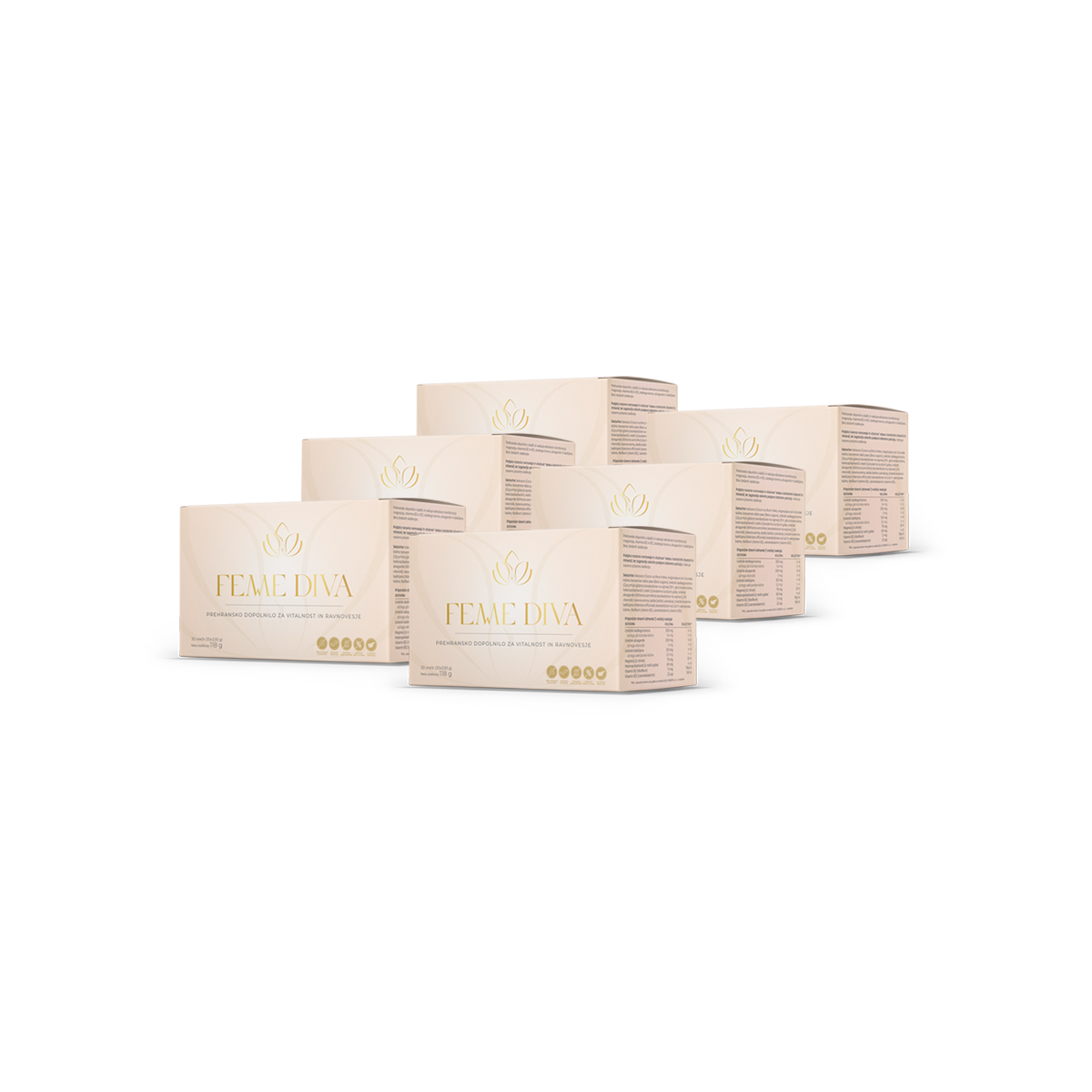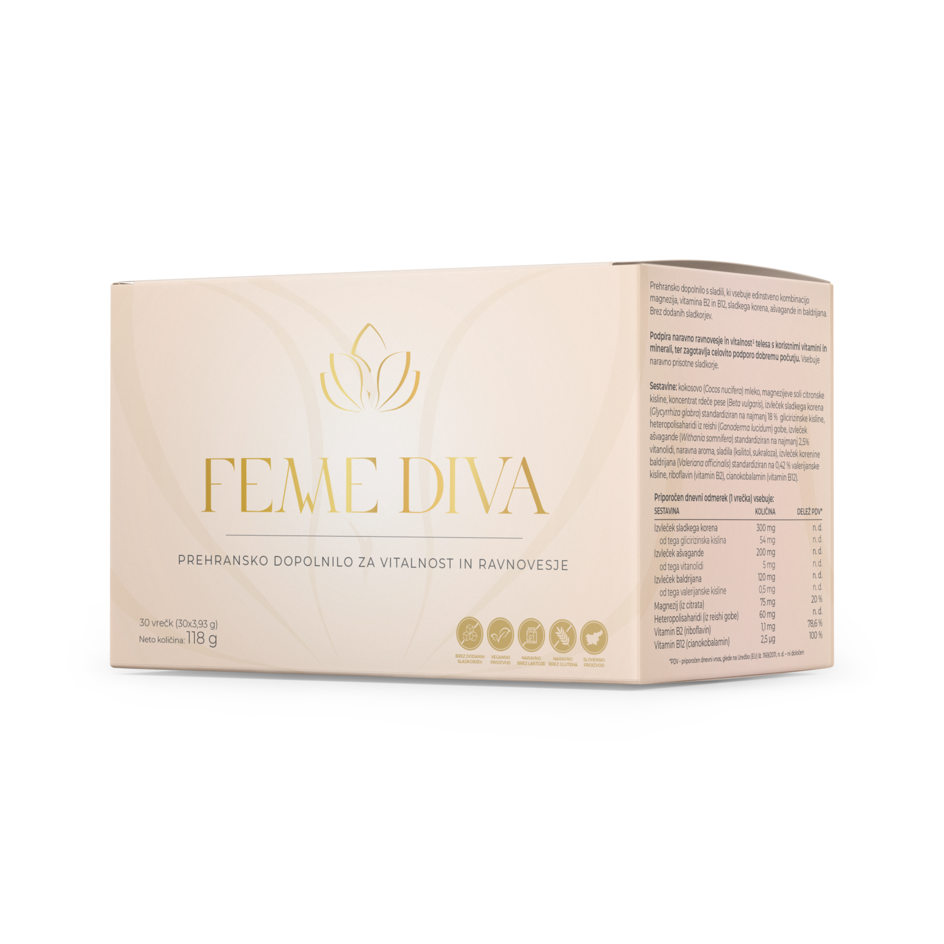 FemmeDiva je prehransko dopolnilo oblikovano v sodelovanju s strokovnjaki na področju prehrane, ki združuje moč naravnih sestavin, kot so magnezij, ašvaganda, izvleček sladkega korena, reishi gobe, baldrijan ter vitamina B2 in B12, ki skupaj ustvarjajo edinstveno formulo. FemmeDiva: