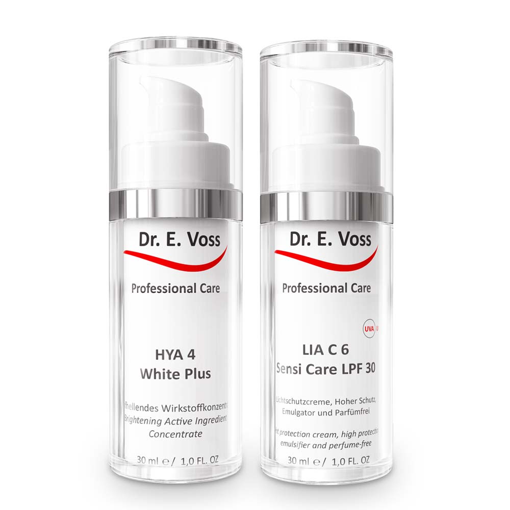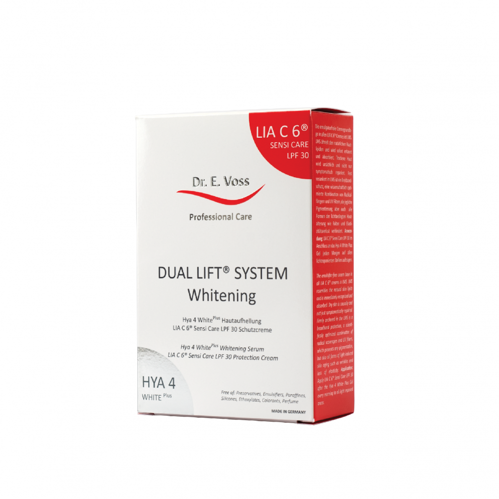 HYA 4 WHITE PLUS vsebuje 7 aktivnih sestavin, od tega pet aktivnih sestavin, ki vsaka po svoje prekinjajo nastajanje melanina v petih različnih stopnjah procesa, od branja zapisa DNA do končnega učinka, ko melanin vznikne na zgornji plasti epidermisa in opazimo pigmentni madež. Štiri od petih sestavin vplivajo tudi na posvetlitev in enakomeren ten kože. HYA 4 WHITE PLUS obenem zagotavlja tudi zaščito pred prostimi radikali in UVA svetlobo. Zaradi večstranskega pristopa gre za edinstven proizvod v svetovnem merilu. Gel za posvetlitev kože HYA 4 WHITE PLUS je primeren za vse tipe kože. LIA C 6® SENSI CARE SPF 30 je posebna krema za zaščito pred soncem. Učinkovito zaščiti še tako občutljivo kožo pred neugodnimi posledicami izpostavljanja sončnim žarkom, kot so opekline in fotostaranje kože. Primerna je tudi za otroke. Hitro se vpije in ne masti kože. Faktor 30 pomeni, da se naravni čas zaščite kože pred učinki sončnih žarkov podaljša za 30-krat, pod pogojem, da izdelek v zadostni količini in enakomerno nanesemo ter da po umivanju in brisanju kože nanos ponovimo. Kljub temu se raje izogibajte intenzivnemu izpostavljanju soncu v opoldanskem času, majhnih otrok in dojenčkov pa nikoli ne izpostavljajte neposredni močni sončni svetlobi. Krema LIA C 6® SENSI CARE LSF 30 vsebuje tudi LIA zaščito (poleg visoke UVB zaščite vsebuje tudi skoraj 100% UVA zaščito ter HDBM – “pametni” lovilec prostih radikalov). Pakiranje: 2x 30 ml