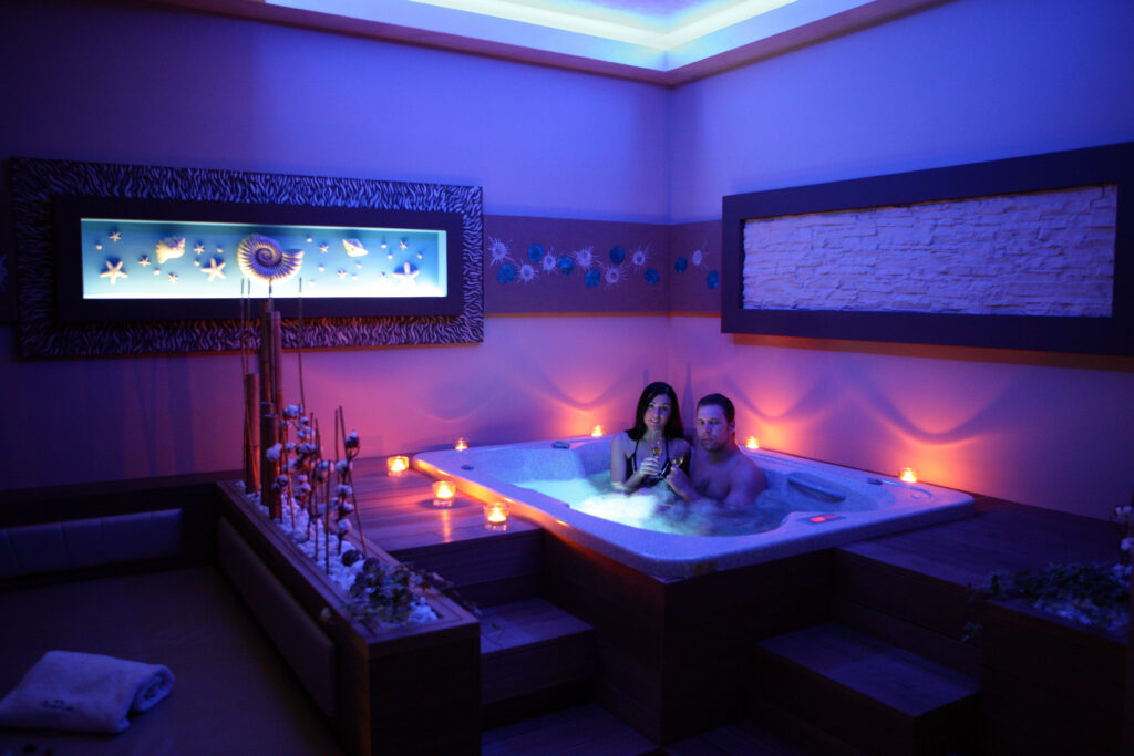 Vajino razvajanje se bo odvijalo v prijetnem ambientu, ki vključuje luksuzen jacuzzi, napolnjen s svežo vodo pred vsakim obiskom, parno savno, ki bo s svojo toploto poskrbela za sprostitev telesa in duha, udobno ležišče, kjer si bosta lahko vzela trenutek za počitek, ter prostorno tuš kabino za osvežitev.
